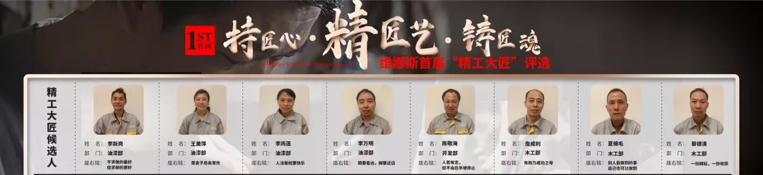 为了赓续传承匠心匠艺,维娜斯以每年第四季度(10~12月)为“精工大匠”评选季。首届维娜斯“精工大匠”评选,分别针对木工、油漆、安包和设计部门,设立了精工巧匠、漆艺大匠、妙手彩匠以及天工大匠四大奖项,旨在有效激励优秀员工,为所有员工树立标杆,加强员工对企业的认同感和归属感,发掘人才、表彰人才,真正做到“持匠心、精匠艺、铸匠魂”。