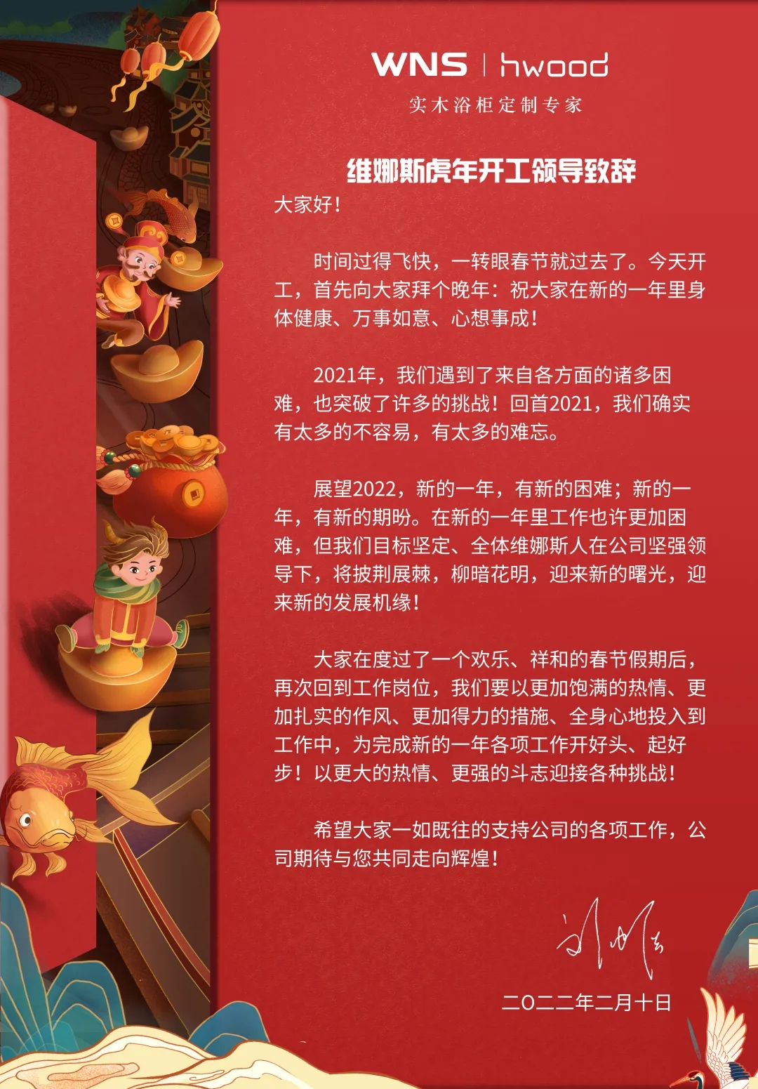 维娜斯虎年开工的炮声已经响彻云霄!在新一年战斗开启之际,维娜斯企业祝全国客户、用户、合作伙伴:虎年腾飞,家业兴旺,卫业翻番,一切蒸蒸日上!