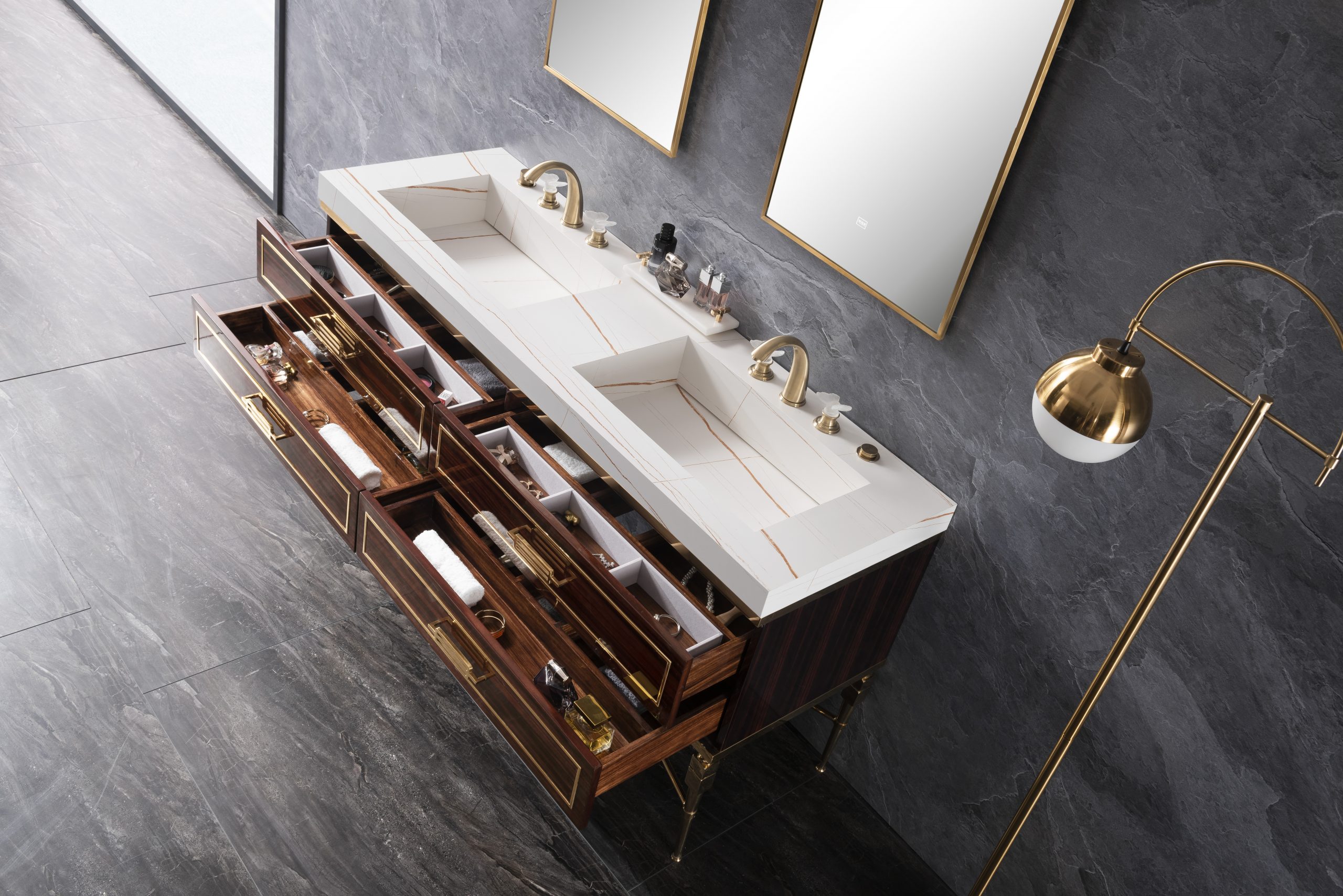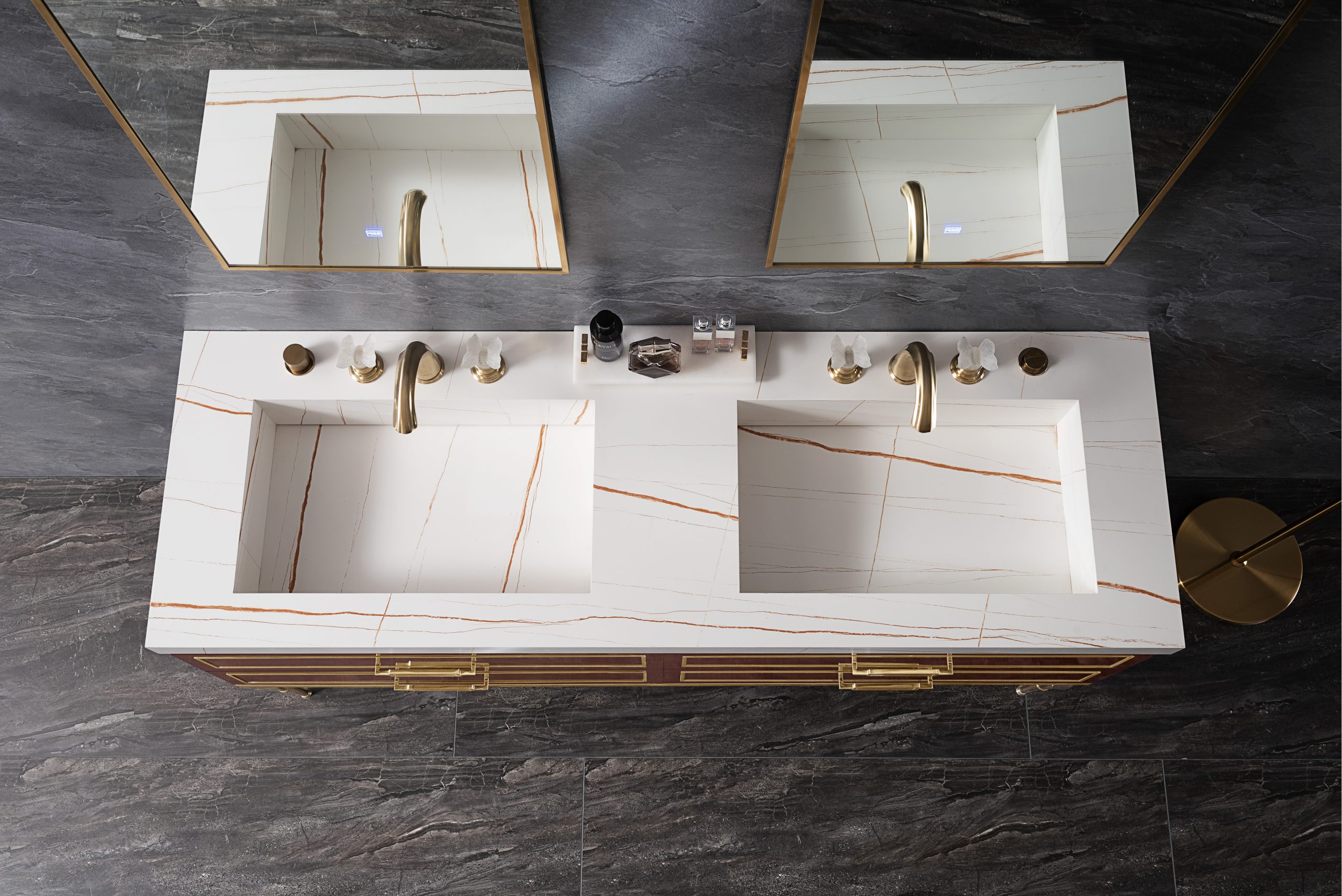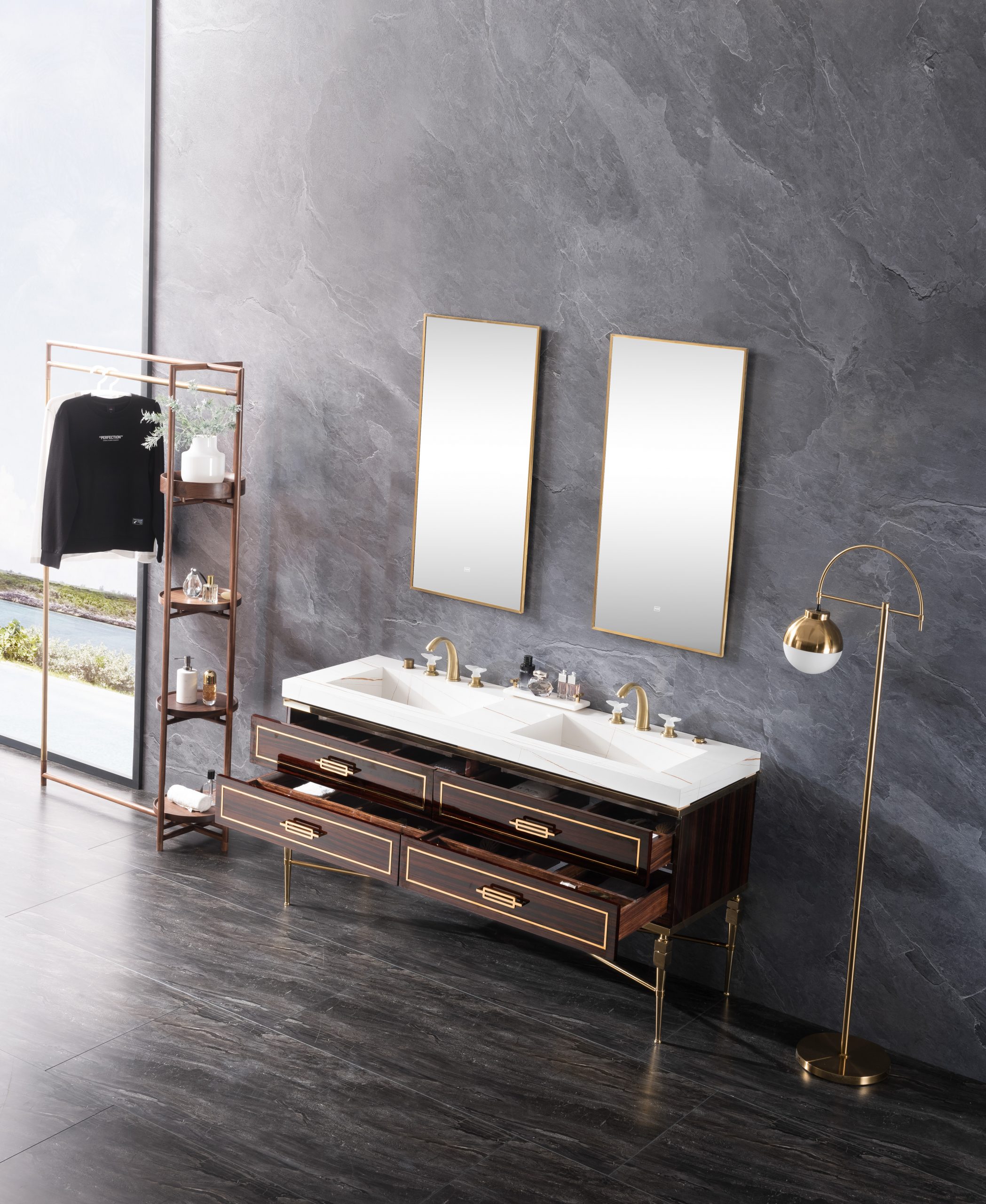 主柜(Cabinet):1600*520*850 金属背光镜JT501:500*1000 台面:劳伦金白岩板整体盆 (三孔龙头) 材质:黑紫檀 Material:Black rosewood 颜色:高光黑檀色(可做哑光) Color: High-glossy rosewood color (Matte finish is available)