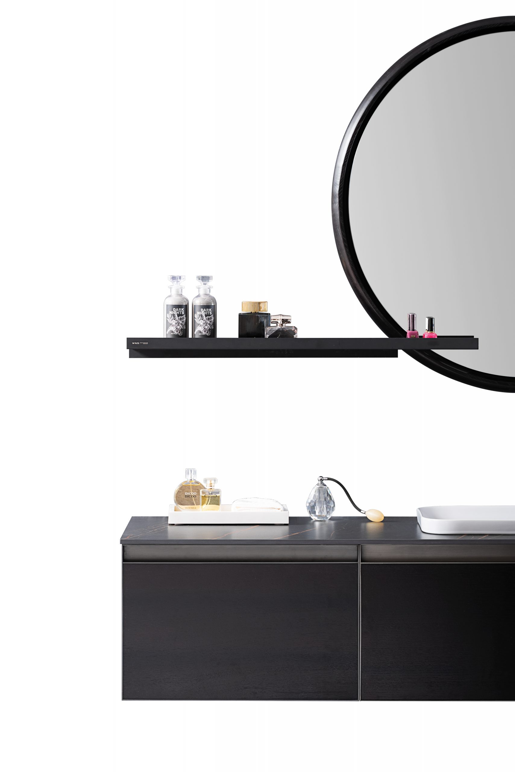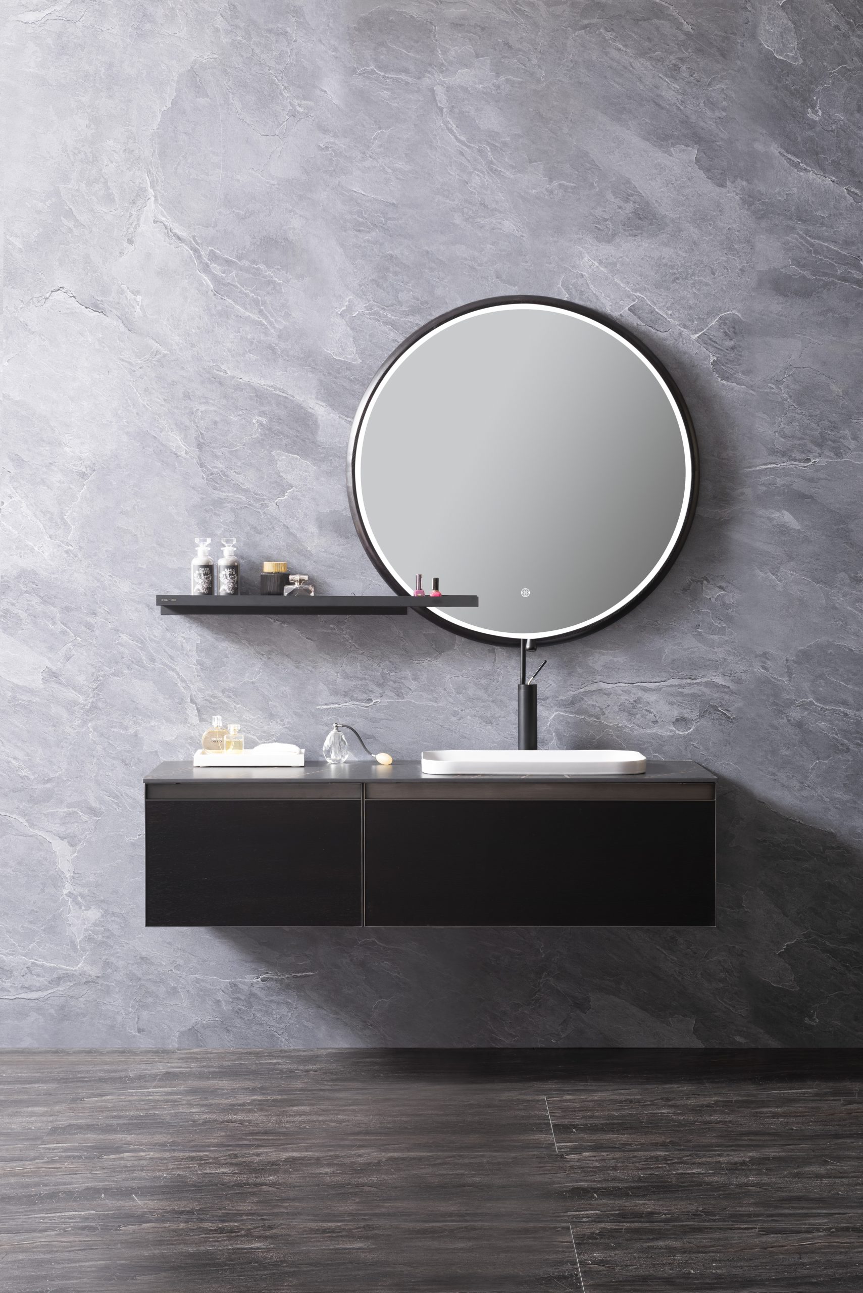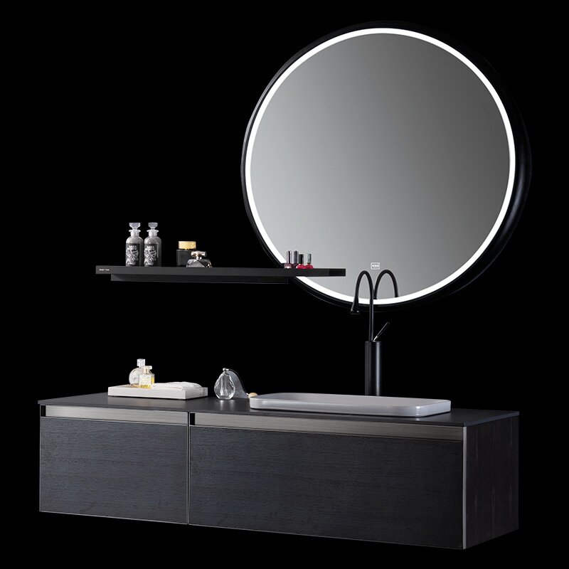 主柜(右盆)(Cabinet):1500*583*400 木框发光镜:圆1000 金属层板CJ900E(右开口):900*125 台面:莎罗兰岩板(单孔龙头) 台中盆:2676-600 材质:美国白腊木 Material:America Ash 颜色:烟熏色 Color:Smoky color