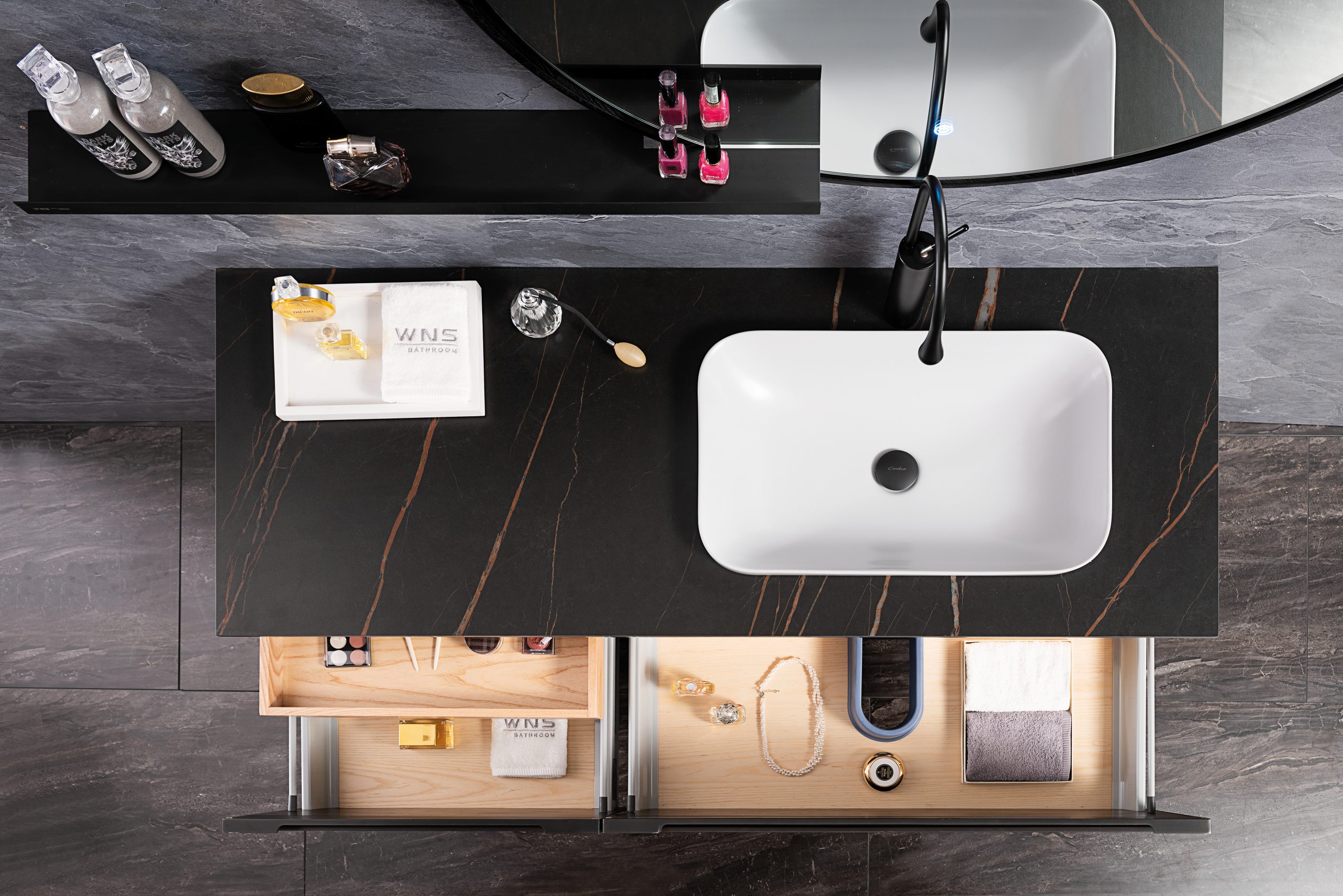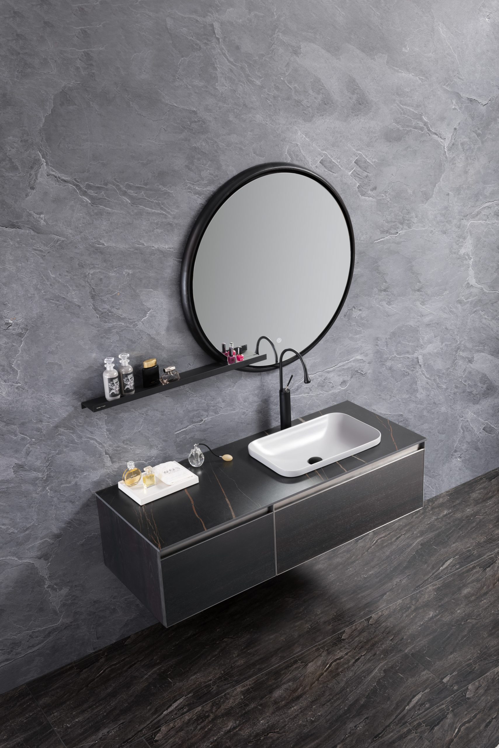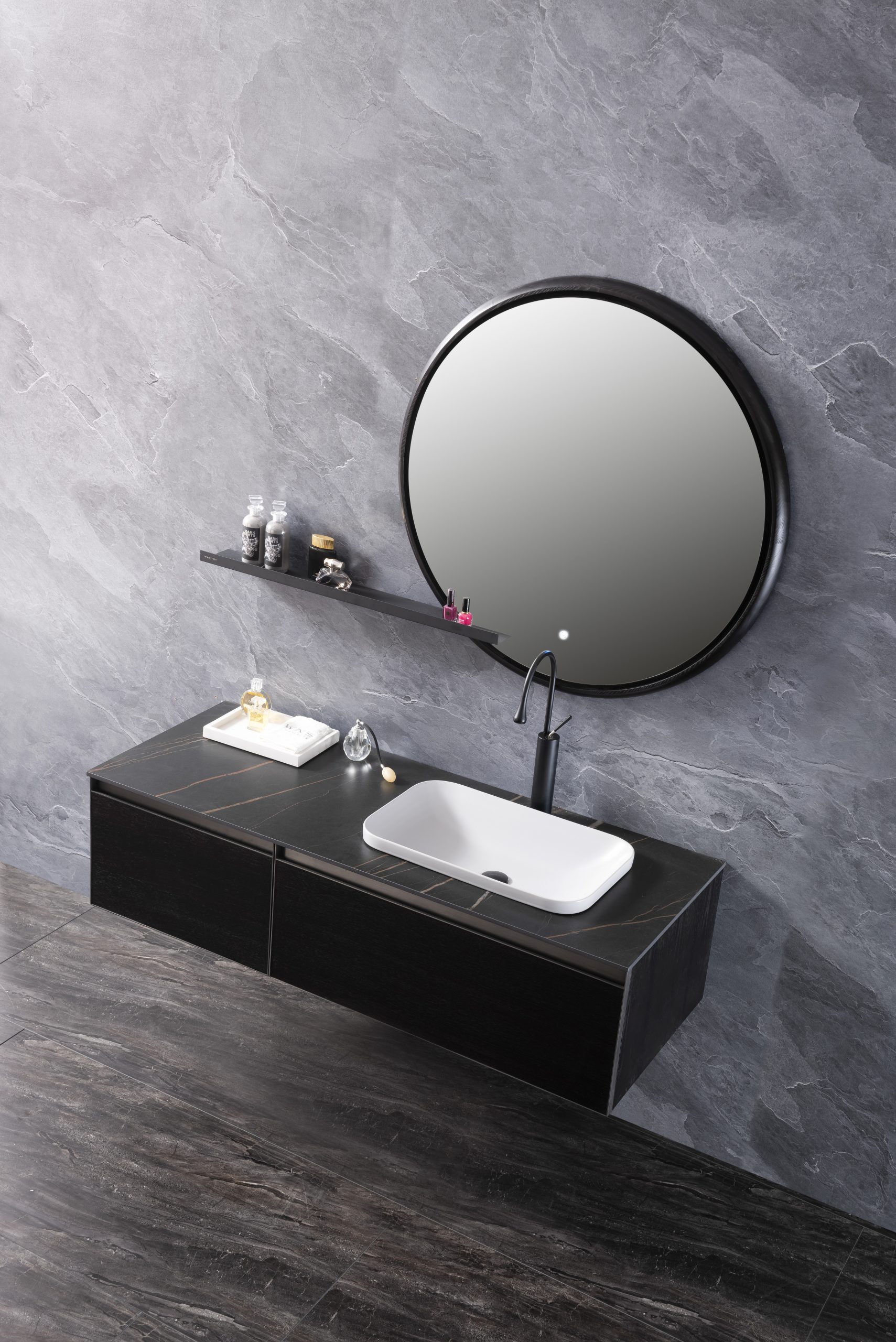 主柜(右盆)(Cabinet):1500*583*400 木框发光镜:圆1000 金属层板CJ900E(右开口):900*125 台面:莎罗兰岩板(单孔龙头) 台中盆:2676-600 材质:美国白腊木 Material:America Ash 颜色:烟熏色 Color:Smoky color