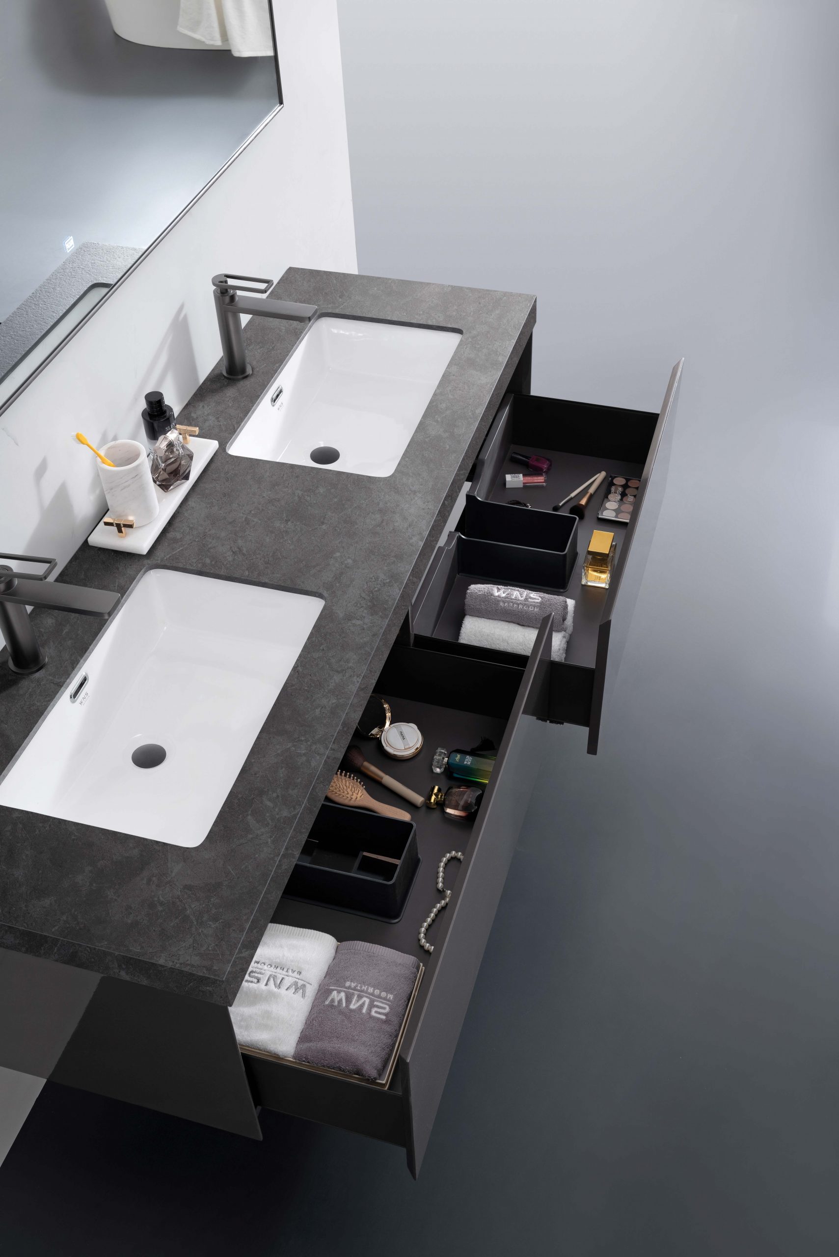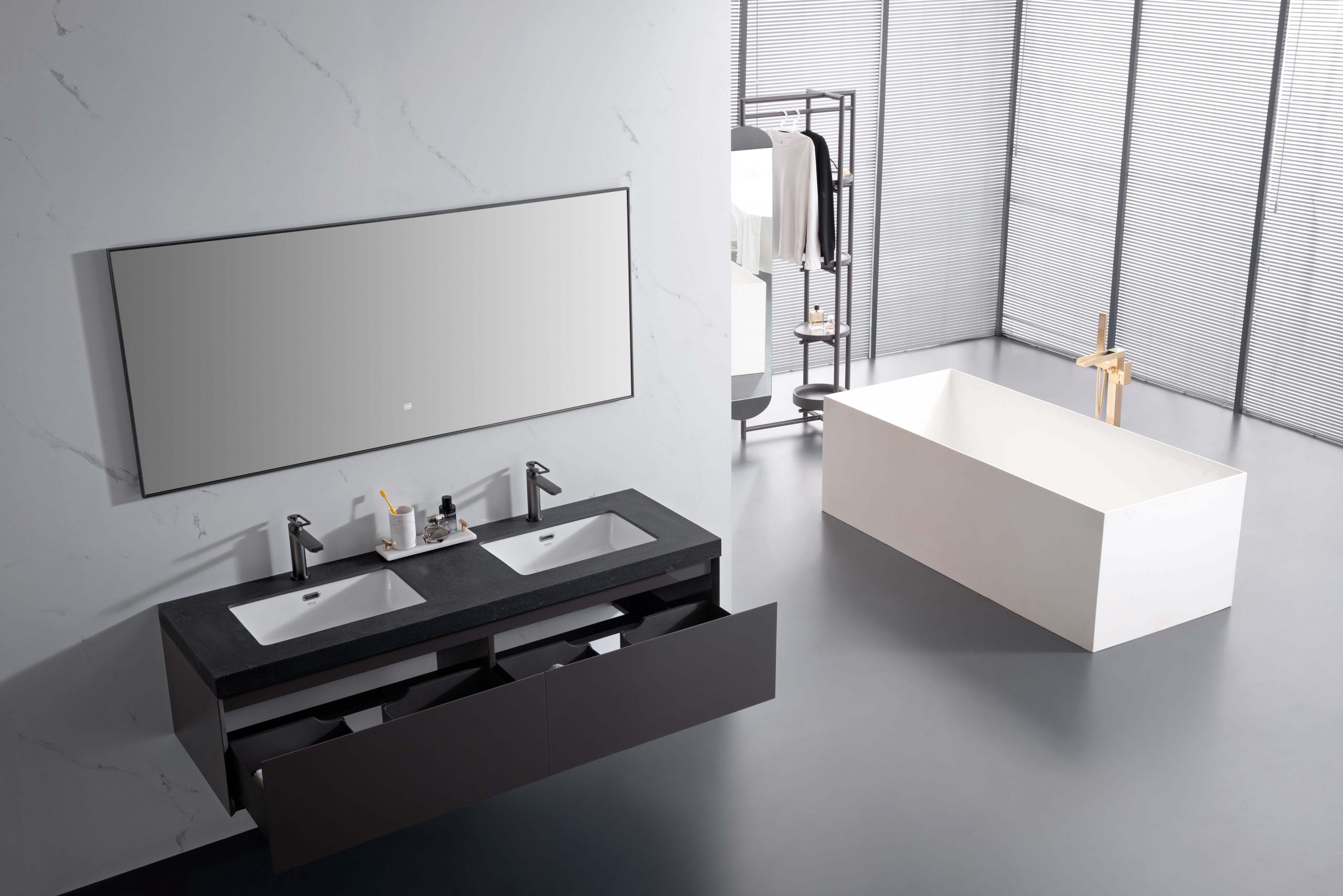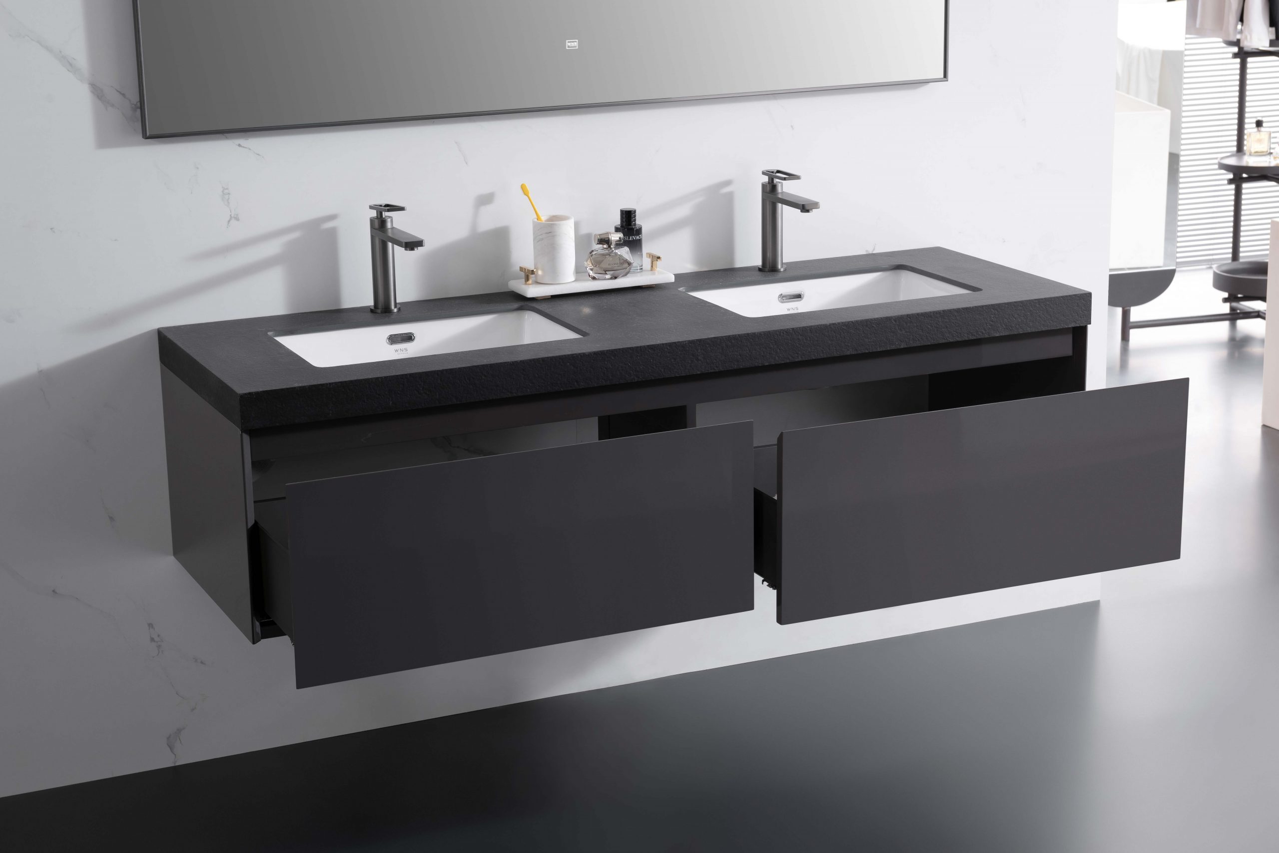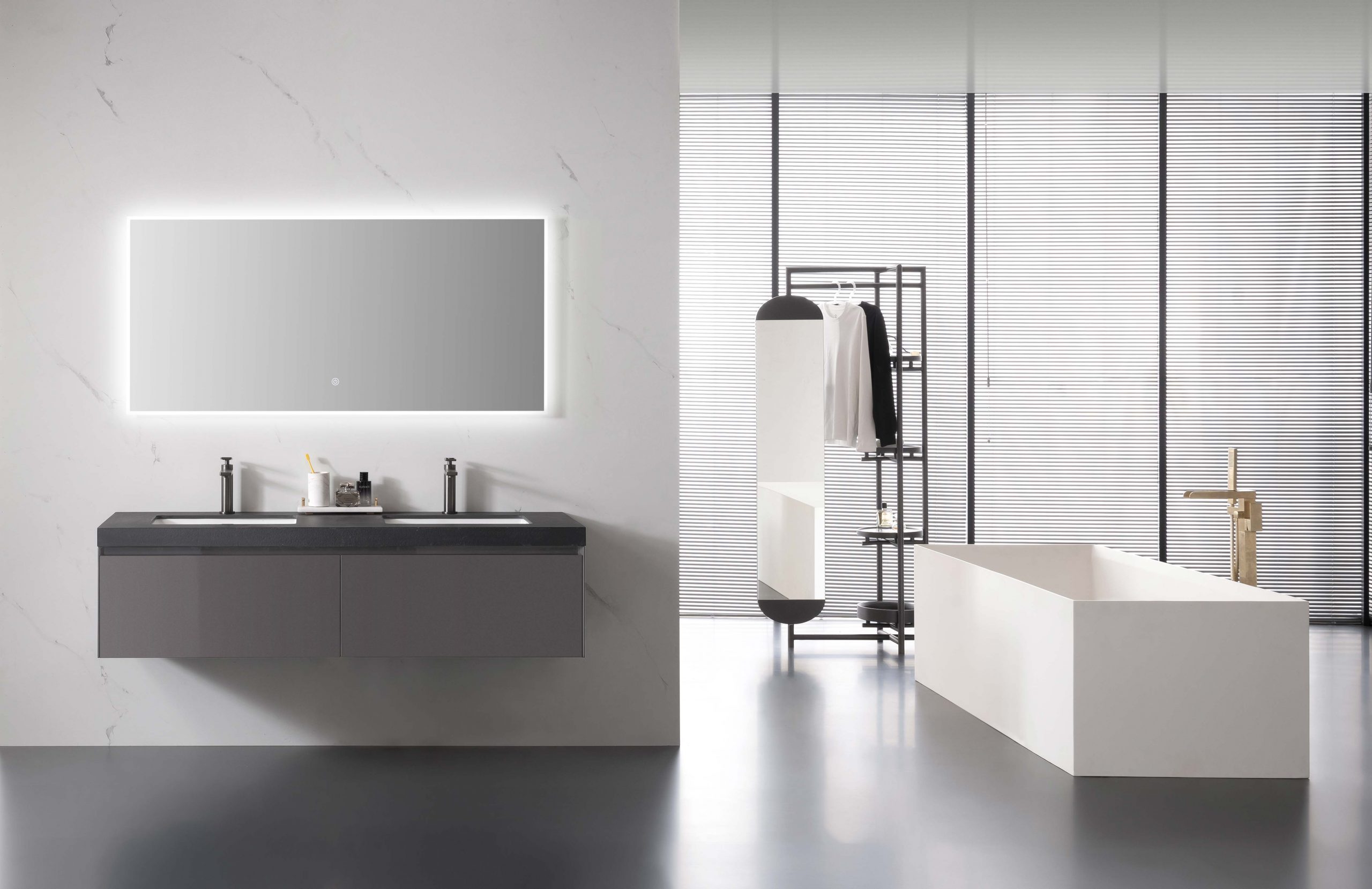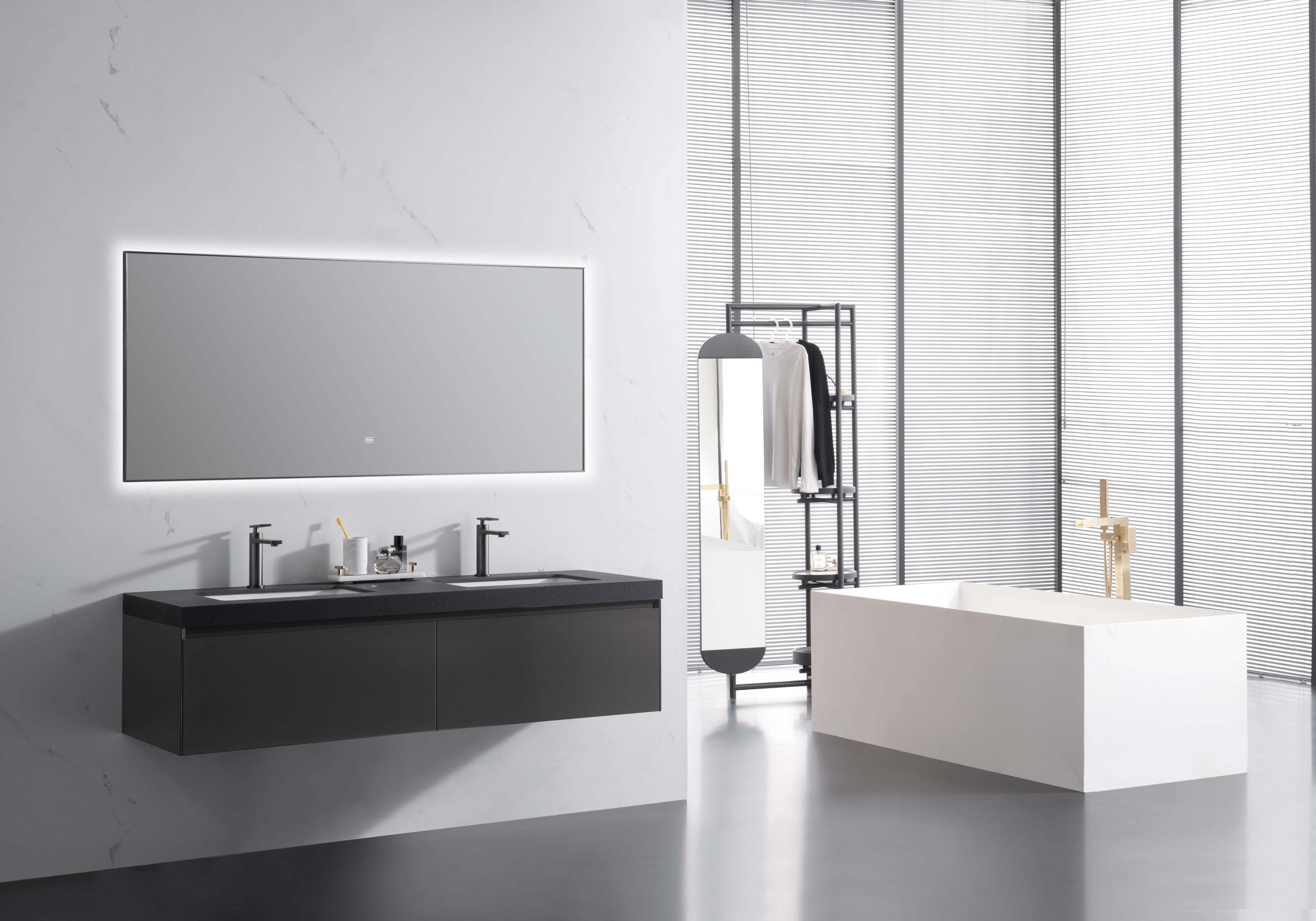 主柜(Cabinet):1600*530*420 铝合金边框发光镜:1550*700 台面:维克灰岩板(高边 60MM, 单孔龙头) 台下盆:WNS0422 材质:泰国橡木 Material:Thailand rubber wood 颜色:高光枪灰色(可做哑光) Color: High-glossy gunmetal gray (Matte finish is available)