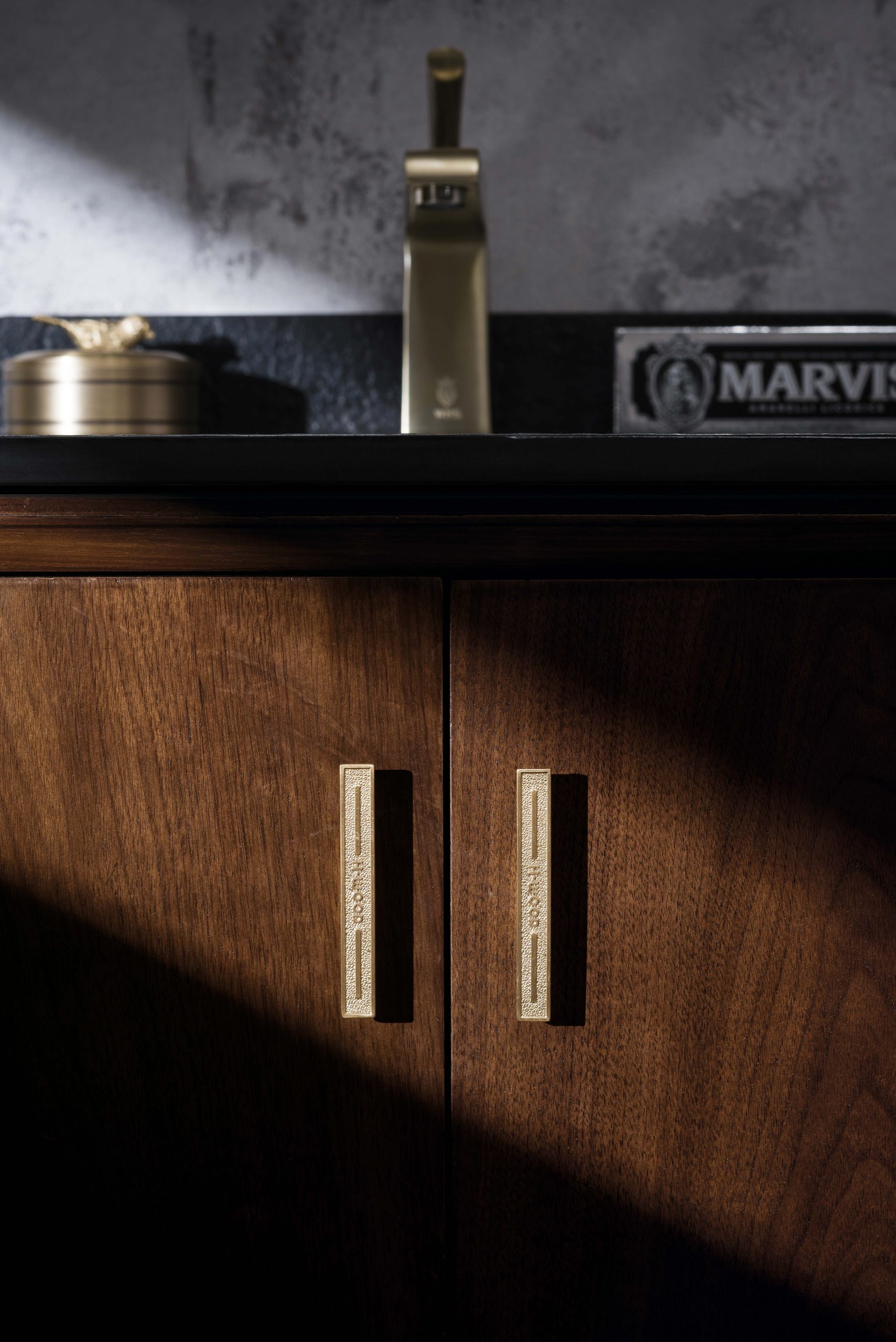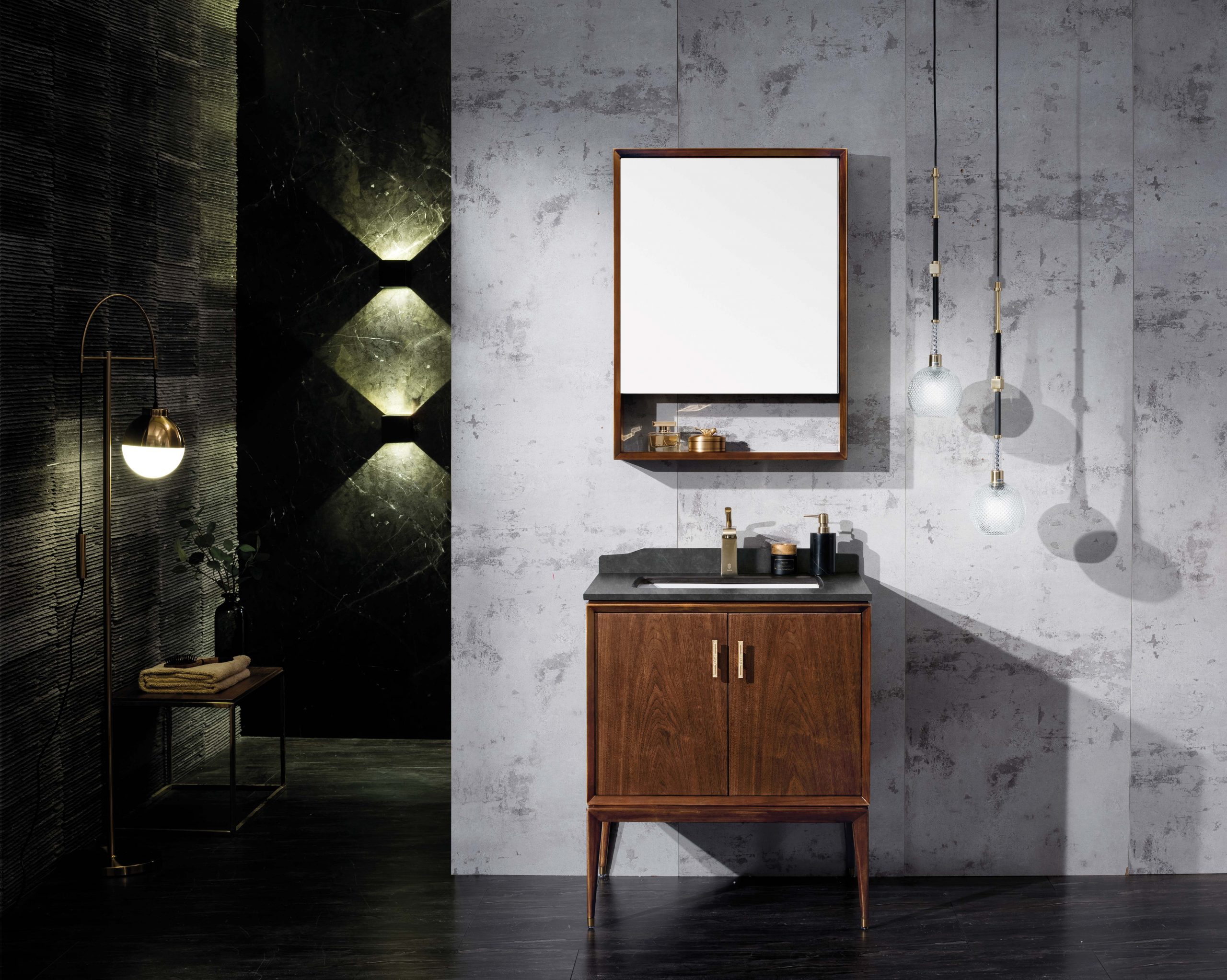 主柜(Cabinet):705*590*850 镜柜 W7620(右开门):620*145*820 台面:维克灰岩板(单孔龙头) 台下盆:WNS2044 材质:胡桃木 Material:Walnut 颜色:原木色 Color:Natural wood color