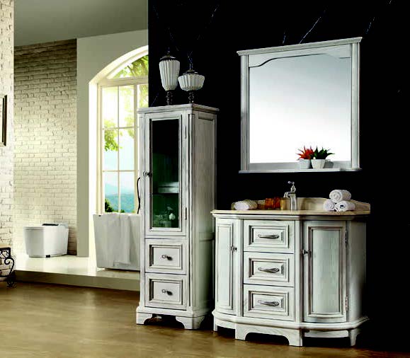 WNS-2610附柜(右开门) 主柜:1000x600x850mm 镜子:900x900x110mm 附柜:500x390x1600mm 材质:美国白腊木 颜色:古韵白 台面:经典米黄 台面边形:加厚经典边 台盆:22″ 产品类别: A类 单孔龙头+去水:WNS-83001L