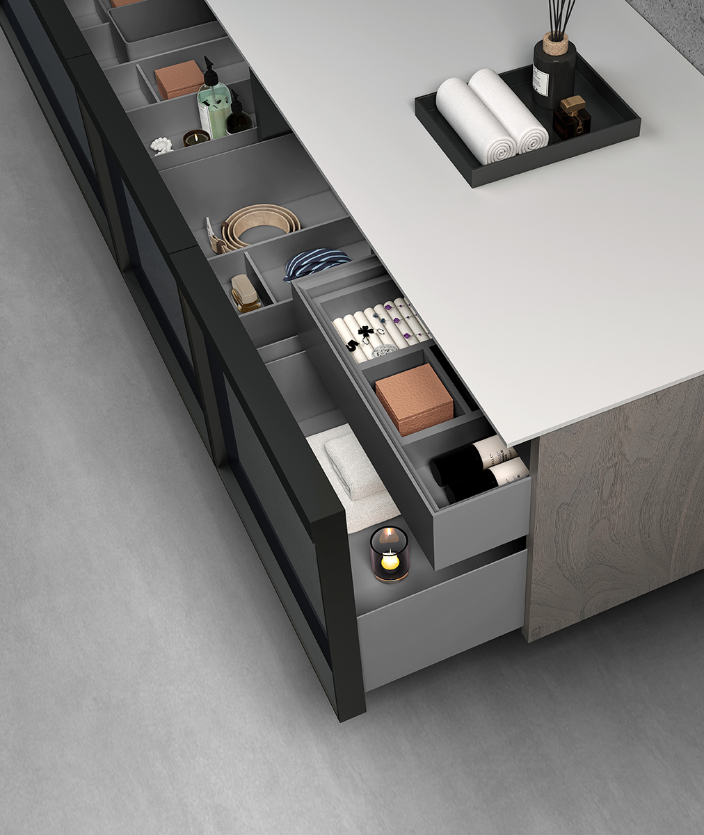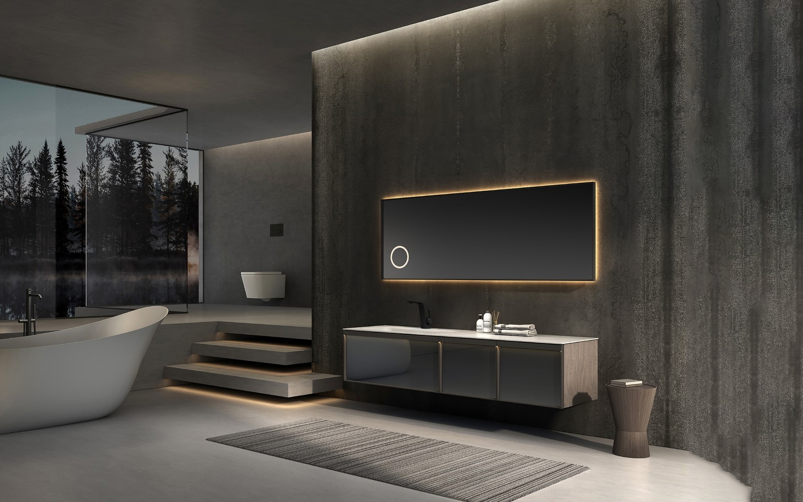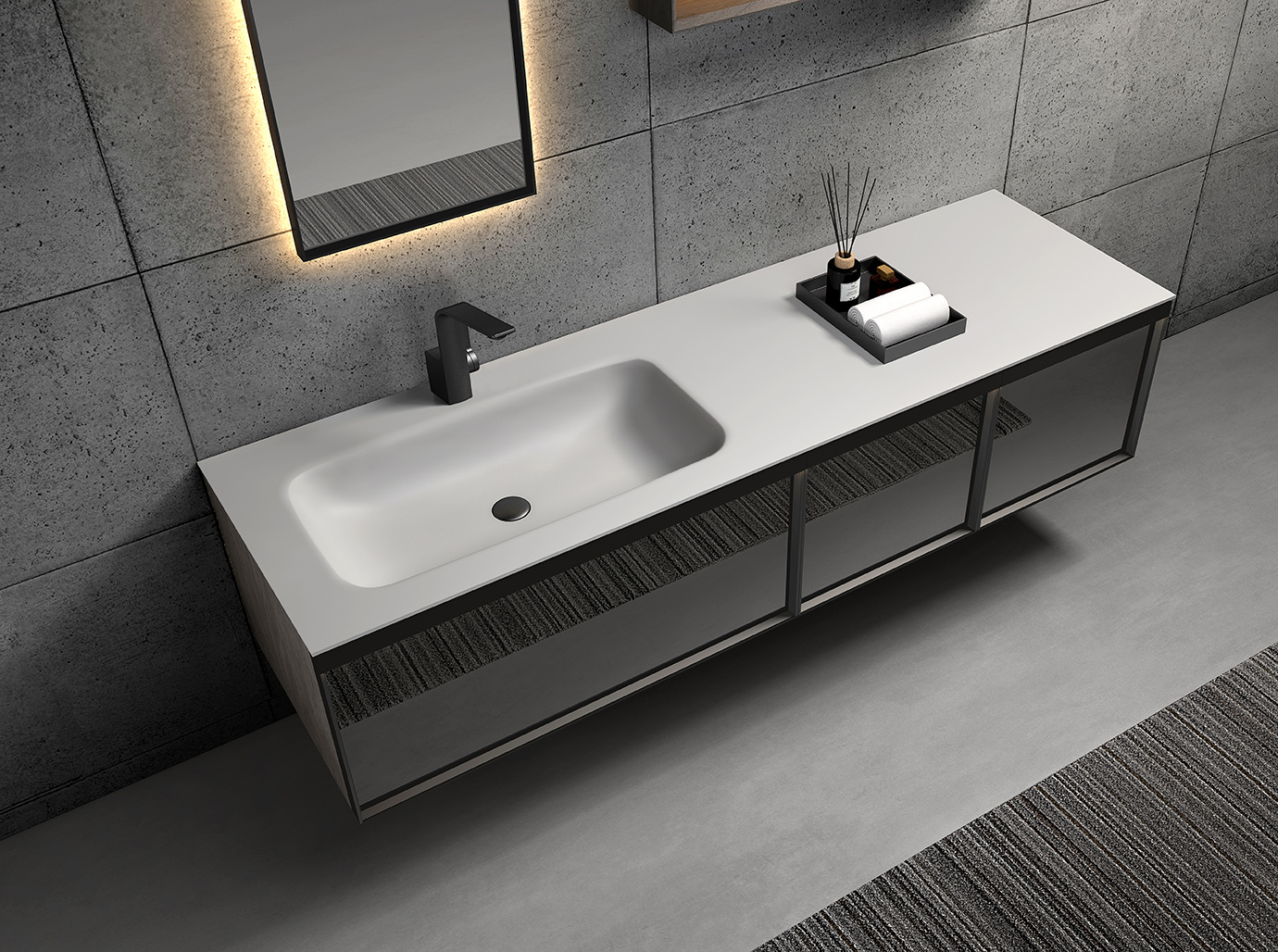 主柜:1800x535x420 抽面框铝材颜色:帝菲尼灰 铝框背光镜(帝菲尼灰、暖光):420×1360 置物盒(暖光):850x165x186 台面:奇美石一体盆(白色、单孔) 材质:南美胡桃木 颜色:高透胡桃灰